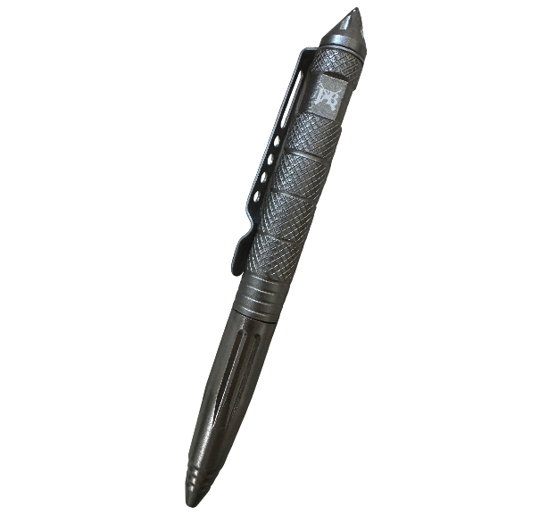 A rugged tactical pen with with a hardened steel tip engineered to shatter glass