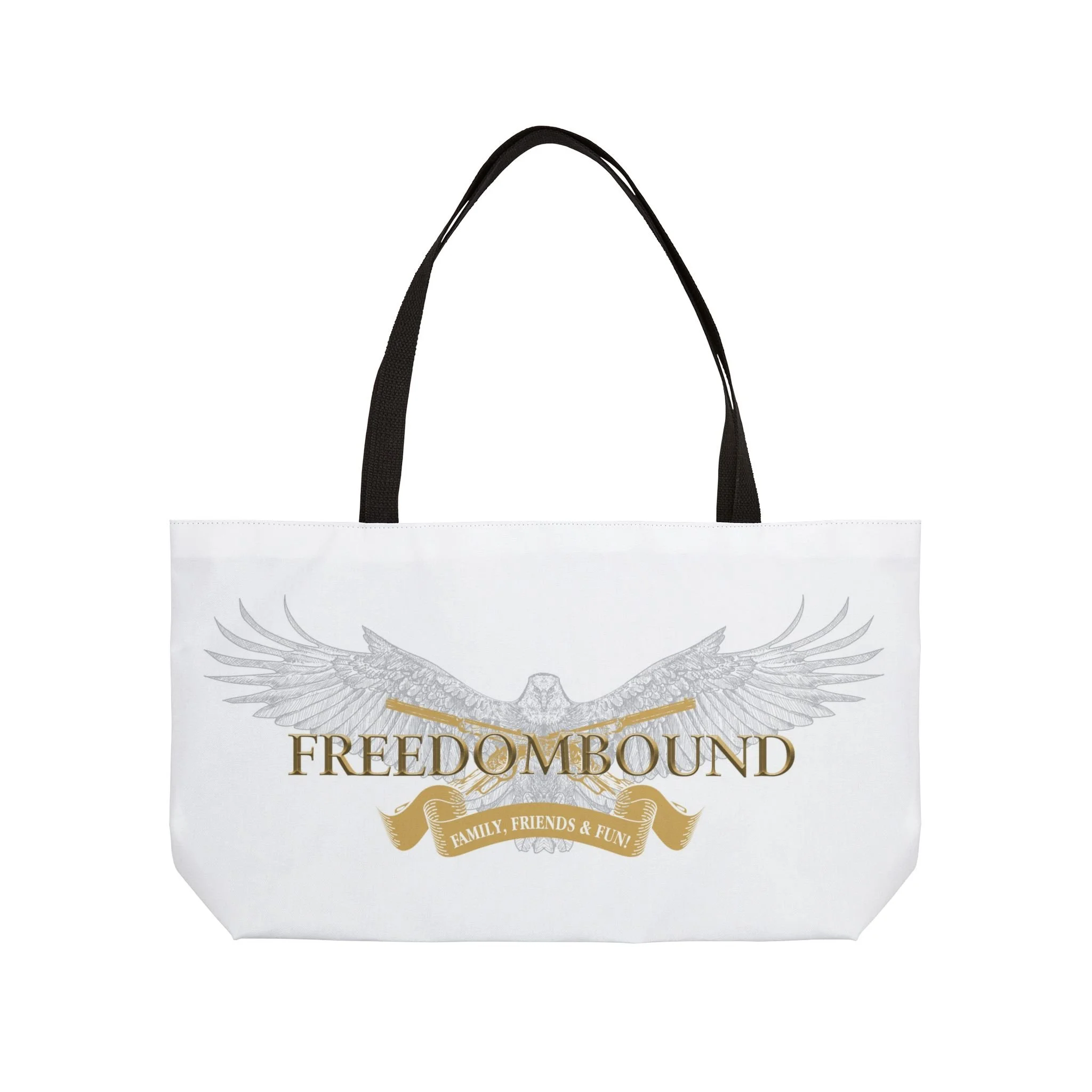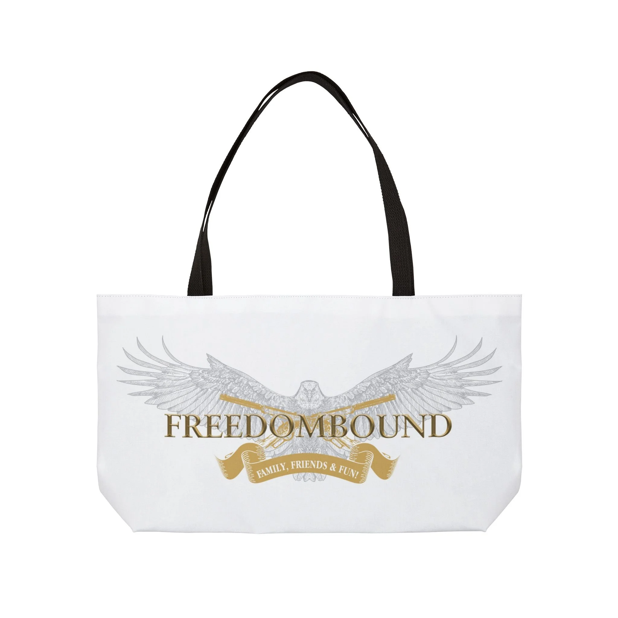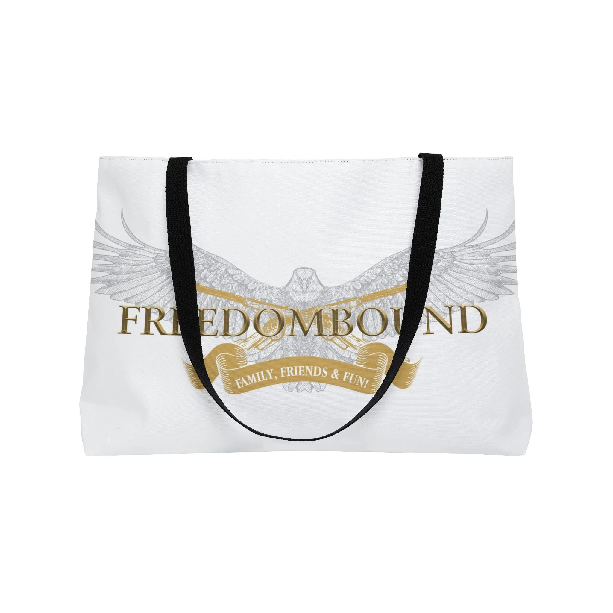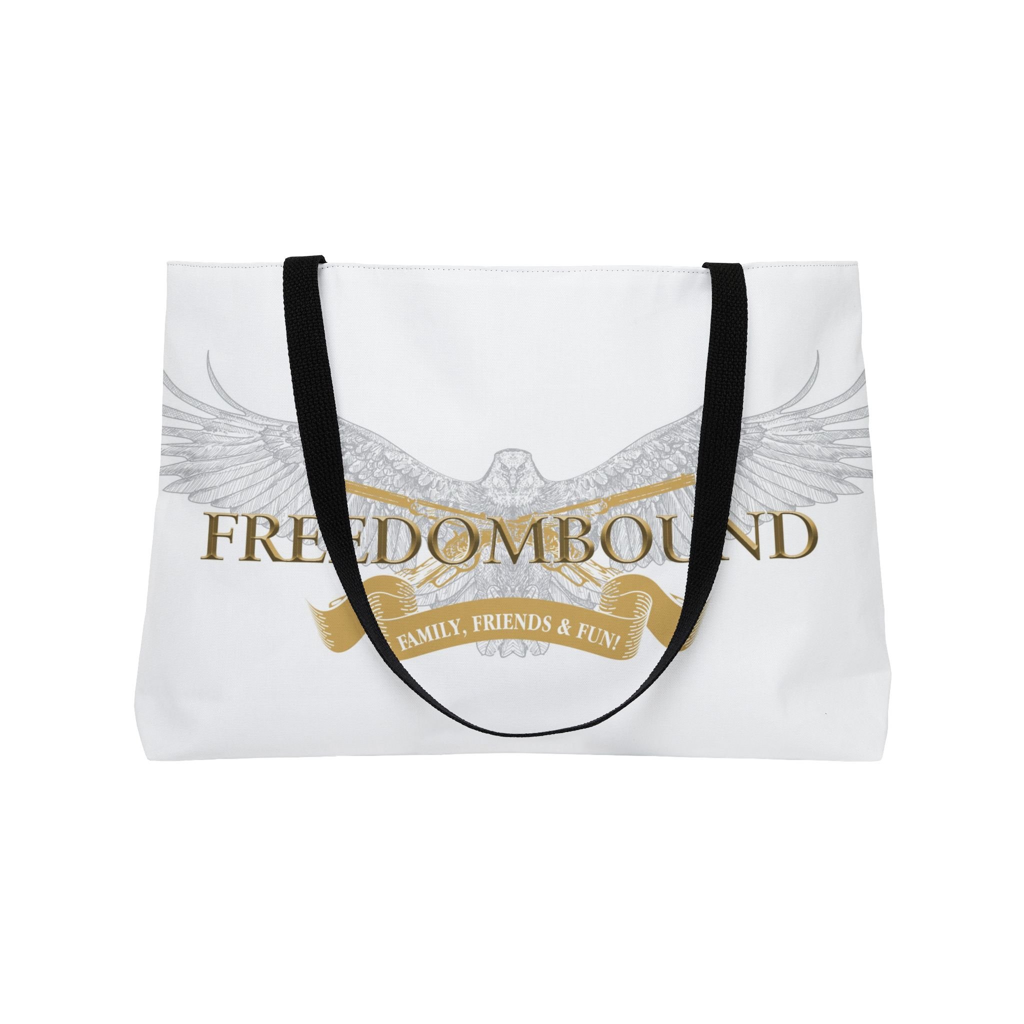A roomy, all-over print tote made to carry the things that matter — from weekend plans to daily essentials. The design centers on a soaring eagle with outstretched wings and the word “FREEDOMBOUND” in warm, antique-gold lettering, layered over a subtle banner and soft gray feather detailing. The sturdy black woven handles sit comfortably on your shoulder while the t-bottom gives structure and keeps items upright. It feels like a companion for road trips, market runs, and any day you want to travel light but with purpose.